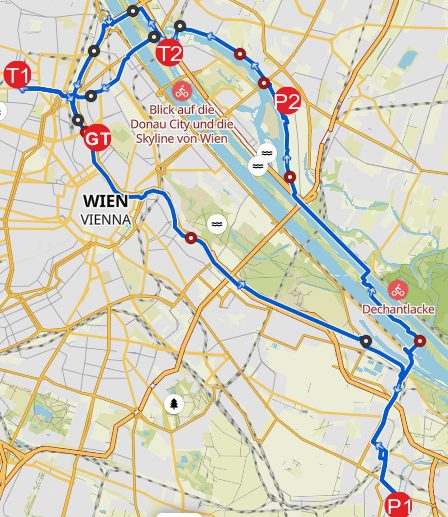 Samstag 19. September 2026Treffpunkte:09:45 - T 1 - S 45 Station - Krottenbachstrasse, F. Ekkamp09:30 - T 2 - U6 Station - Neue Donau, W. Rehberger10:00 - GT - Friedensbrücke Radweg (gemeinsamer Treffpunkt)P1 - Pause - Gasthaus Zur goldenen KetteP2 - Pause - Oase - NF Alte Donau